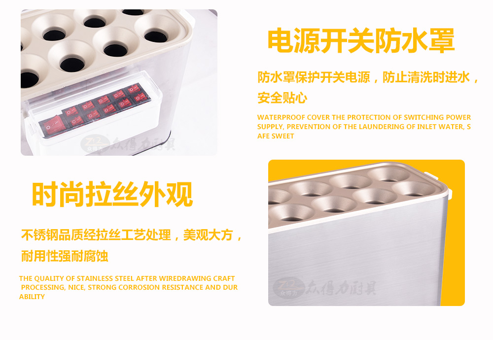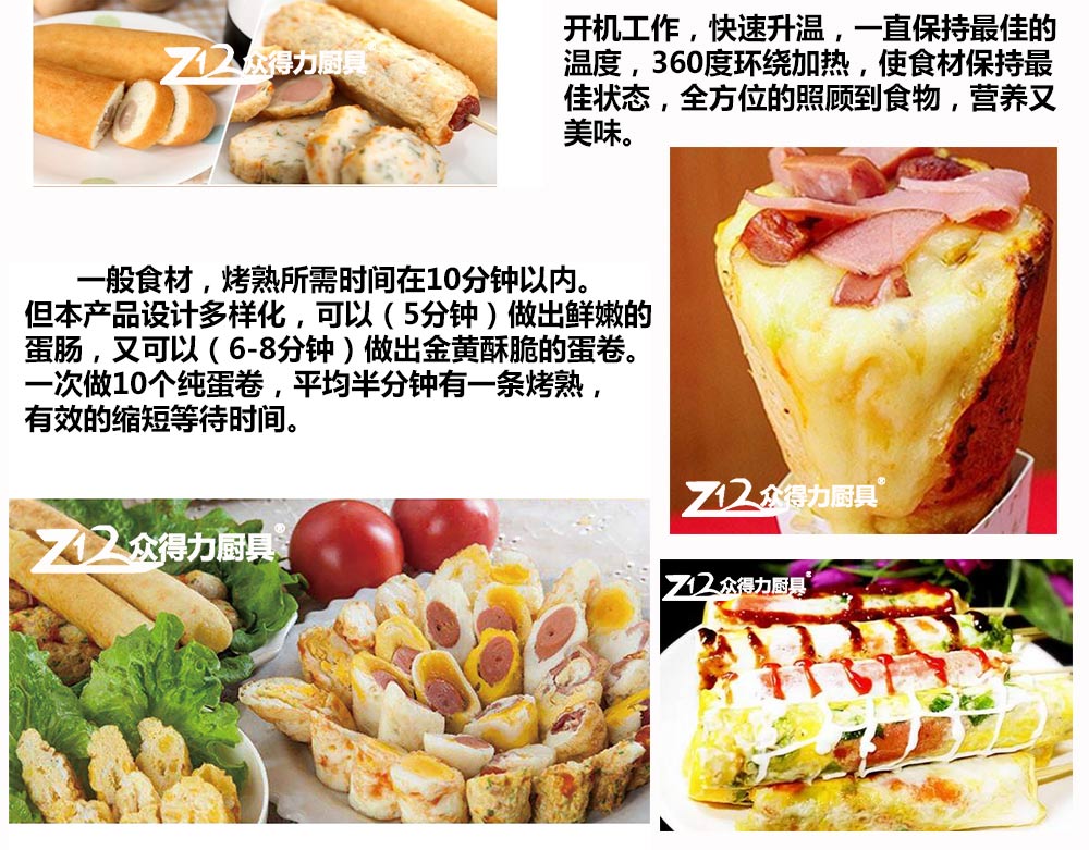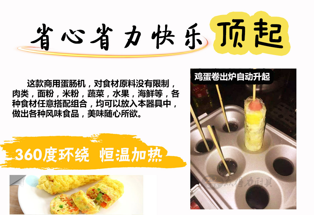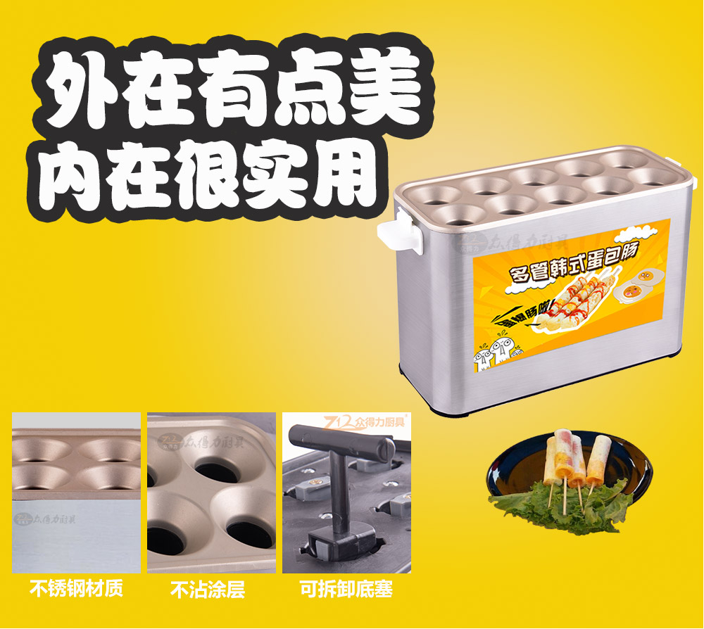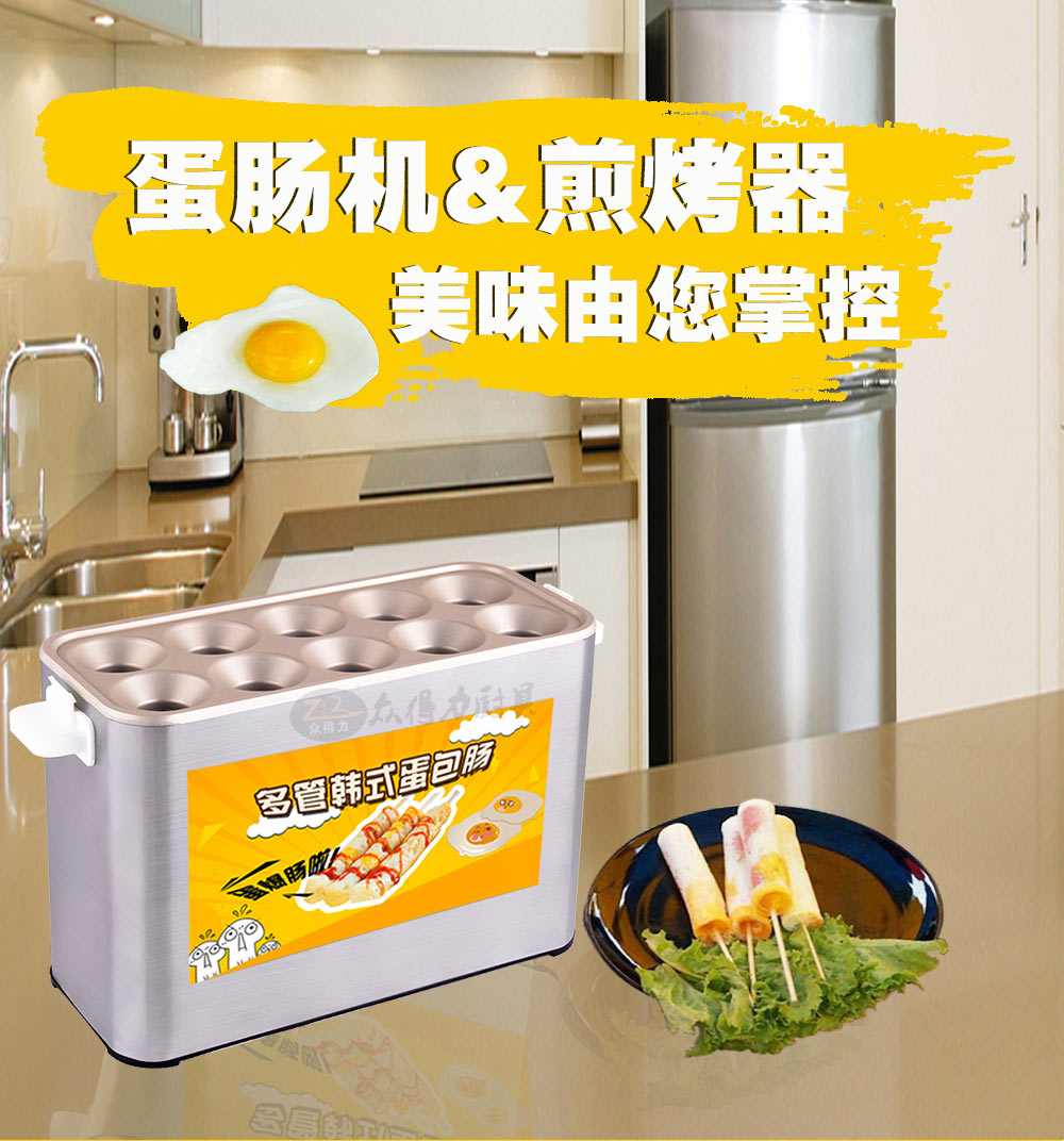 燃?xì)獾澳c機(jī),電熱蛋腸機(jī),快速升溫,360度環(huán)繞加熱,5分鐘即可做出鮮嫩的蛋腸,一次做十個(gè)蛋卷,平均每半分鐘即可烤熟一根,有效縮短等待時(shí)間,提高產(chǎn)品銷售額,蛋腸蛋卷美味吸引過往人群,小吃致富首選小設(shè)備,操作簡(jiǎn)單。眾得力廚具,給我一個(gè)空間,服務(wù)一輩子。