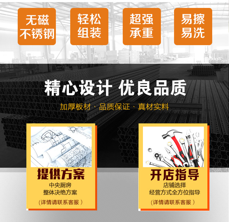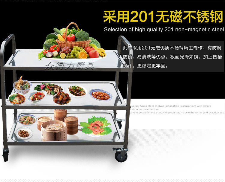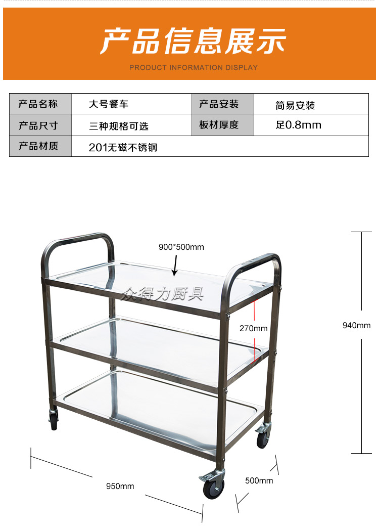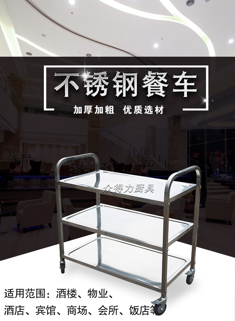 江西眾得力廚具有限公司生產(chǎn)銷售商用廚具,食品機(jī)械,提供中央廚房工程項(xiàng)目整體解決方案。不銹鋼餐車有大號(hào)、中號(hào)、小號(hào),本公司生產(chǎn)銷售的不銹鋼餐車系列均采用201無磁不銹鋼材質(zhì),板材厚度足0.8mm,整機(jī)拆裝方便,結(jié)構(gòu)牢固,承重能力強(qiáng)。