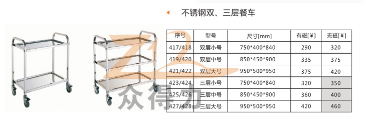 眾得力不銹鋼餐車系列價(jià)格及尺寸: