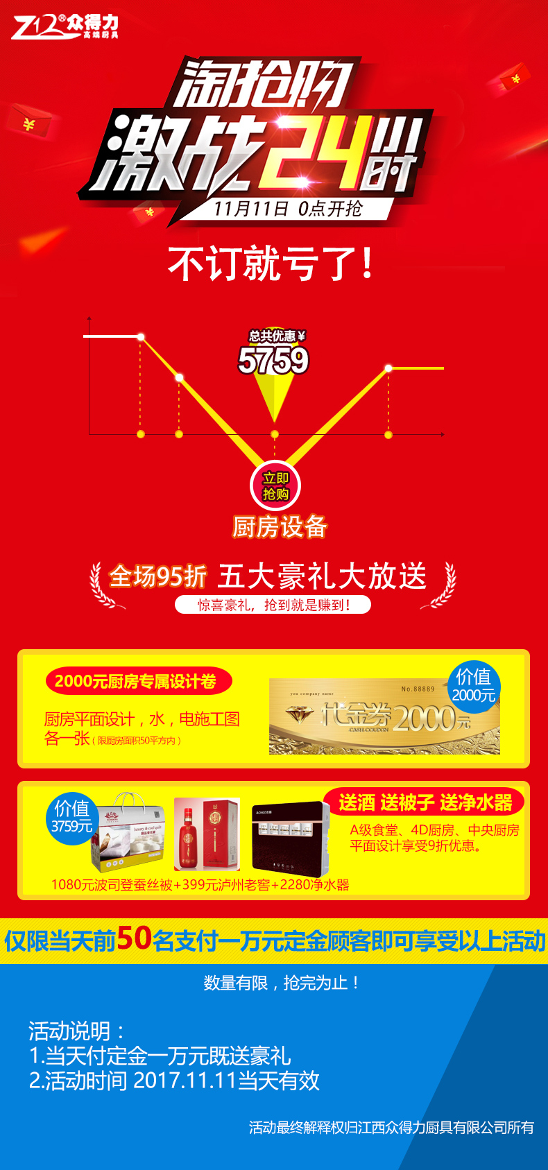 江西眾得力廚具有限公司雙11期間,舉辦訂廚房設(shè)備送豪禮活動,現(xiàn)場火爆,豪禮大放送,預(yù)付1萬元廚房設(shè)備定金,獲5759元精美禮品大禮包